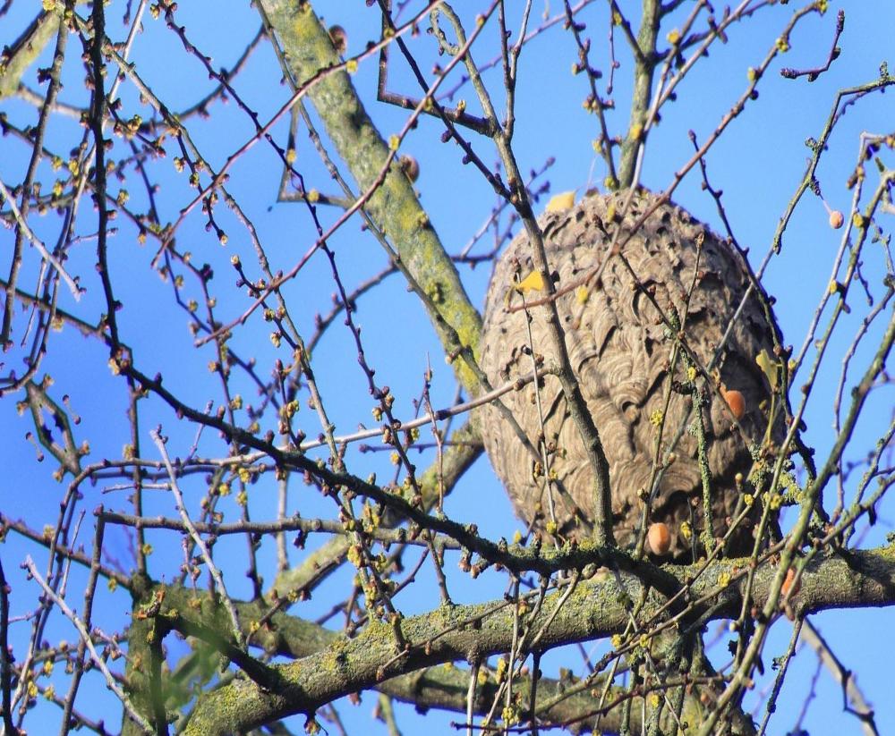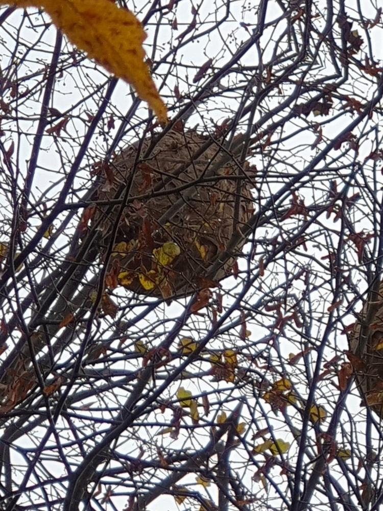 Imposant (taille ballon de foot à > 80cm). Souvent situé en hauteur dans les arbres ou bâtiments. Contient des milliers d'individus.