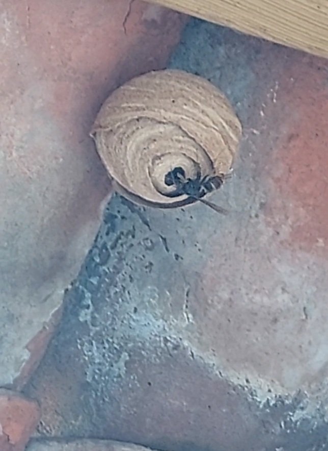 Petit (taille d'une orange). Situé à l'abri (cabanon, toit, garage) et souvent à faible hauteur. Construit par la reine seule.
